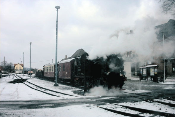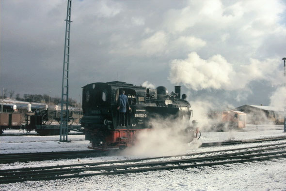 Zum heutigen 23.Türchen (ich hätte beinahe wieder Advent geschrieben) mal ein Winterbild da ja in diesen Jahr in unseren Breiten nicht mehr mit Schnee zu rechnen ist. Das Tagewerk ist bald vollbracht und so rollt der Zug den gefährlichen Goetheweg bereits verlassend den Endbahnhof in Wernigerode entgegen. Warum Gefährlich? Nun in den Anfangsjahren mit Winterlichen Brockenverkehr wichen viele Brockenwanderer auf die vom Schnee geräumte Bahnstrecke aus um nicht im Tiefschnee stecken zu bleiben. Das ist aber im Winter bei Schnee schon nicht ganz ohne, denn der Schnee dämpft alle Zuggeräusch fast gegen Null. Und so sind wir oft in brenzliche Situationen gekommen. Aber da sind wir nun durch. Und nun schnell nach Hause denn Morgen ist Heiligabend und da freuen sich alle auf Geschenke. Da Otto morgen dran ist mit dem Türchen und Heiligabend ist, hoffe ich und wünsche es mir, das ich genau aus diesen Türchen das Allerheiligste HSS 2 holen darf. Na nun drückt mal alle die Daumen ob diese Überraschung gelingt. Ich wünsche allen Mitforisten Frohe und Gesunde Weihnachtsfeiertage sowie einen guten Rutsch ins neue Jahr.