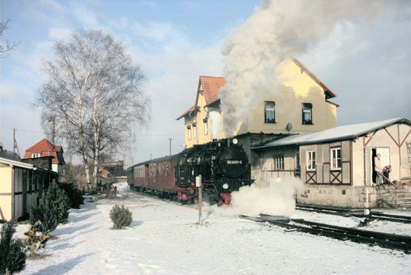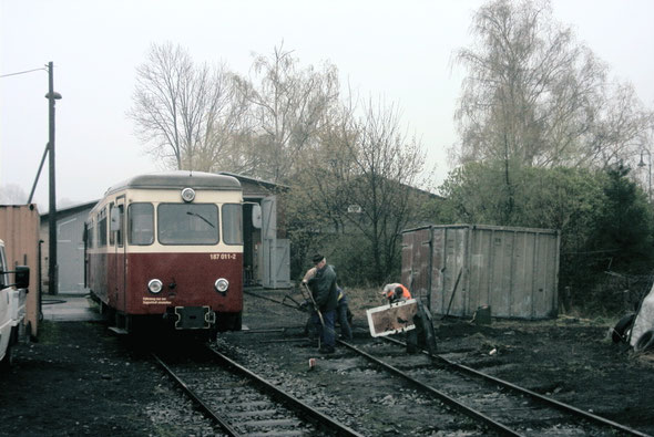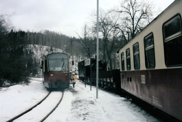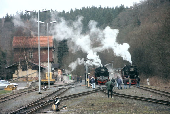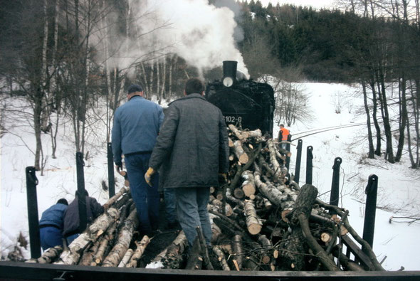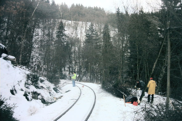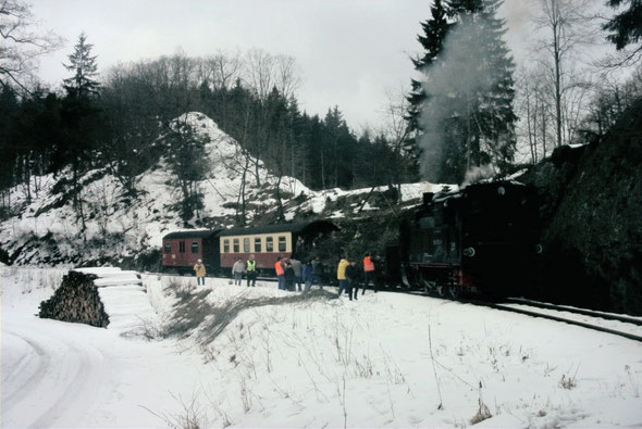 Während meiner Zeit als Mitglied des Freundeskreises Selketalbahn FKSB nahm ich an mehreren Arbeitseinsätzen teil. Am 11. März 2005 ging es an die Strecke zwischen Mägdesprung und Alexisbad. Es sollte Windbruch beseitigt werden. Die Winterstürme und der nasse Schnee hatten viele Äste auf dem Gewissen. Die lagen rechts und links der Strecke und sollten nun entfernt werden. Am frühen Morgen wurde der Planzug von 99 6001 bereitgestellt. Noch lachte die Sonne vom Himmel, aber erste Wolken zogen schon auf. Im Harz herrschte dann ein recht ungemütliches Wetter. Damals war 99 6102 noch betriebsfähig und wurde vom FKSB gepflegt. Für den Arbeitseinsatz wurde ein Arbeitszug bestehend aus Packwagen, Personenwagen und Flachwagen bereitgestellt. Er wurde mit dem Fiffi bespannt. Hier wird der Zug in Gernrode zusammengestellt. Der Arbeitszug folgte dem Planzug. Hinter dem Bahnhof Mägdesprung wurden die Arbeitsgruppen an verschiedenen Stellen abgesetzt. Der Arbeitszug fuhr weiter nach Alexisbad. Stämme und Äste, die zu nah am Gleis lagen, wurden abgeschlagen oder abgesägt. Während meiner Arbeit mit dem Beil verabschiedete sich die Klinge vom Stiel. Nun, es war ein Baumarktprodukt und beide Teile des Werkzeuges hatten keine innige Verbindung mehr. Seitdem rostet das Teil irgendwo im Fels am ersten Felsdurchbruch hinter Mägdesprung. Ich nutze inzwischen daheim eine Axt, die ich von meinem Großvater geerbt habe. Dieses Werkzeug ist praktisch unverwüstlich. Das bereits neben dem Gleis liegende Holz wurde zusammen mit den geschlagenen Stücken aufgeschichtet. Mittags kehrte dann Fiffi mit dem Zug zurück. Der Packwagen barg unter anderem die Verpflegung für die Mannschaft. Nach der Stärkung erfolgten noch die Kreuzung mit dem planmäßigen Triebwagen. Dann wurde der Zug zu den aufgeschichteten Holzstapeln geschoben und wir verluden das Holz. Mit dem beladenen Flachwagen an der Spitze des Zuges ging es am Nachmittag zurück nach Gernrode. Inzwischen gab es absolut kein Fotolicht mehr, sodass die Rückfahrt nicht bildlich dokumentiert werden konnte. Mit diesem Rückblick verabschiede ich mich für heute und wünsche den Forumsfreunden und ihren Familien einen schönen (warmen) 4. Advent.