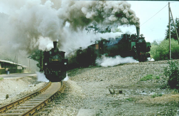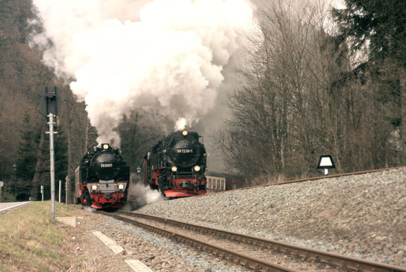 Unter den Eisenbahnfreunden dürfte die Doppelausfahrt in Alexisbad weithin bekannt sein. Inzwischen ist sie längst Geschichte, wird aber immer mal wieder gerne im Rahmen von Sonderfahrten nachgestellt. Natürlich habe ich sie auch selbst erlebt. Allerdings habe ich dieses Ereignis erst nach sehr vielen Versuchen selbst fotografieren können. Wie vielleicht bekannt haben die Harzer Schmalspurbahnen meinen Lebensweg beeinflusst. Sie waren ein Grund, ab März 1981 nach Halberstadt umzusiedeln. Mein erster Arbeitstag als Medizintechniker im Kreiskrankenhaus Halberstadt war der 15. März 1981. Es war ein Sonntag. Ich begann mein Berufsleben also an einem freien Tag. Bis zur ersten Bereisung der Harzer Schmalspurbahnen dauerte es allerdings noch etwa einen Monat. An einem sonnigen Apriltag stand ich in Gernrode auf dem Bahnsteig der Selketalbahn. Gegen 11.40 Uhr erreichte ich mit dem Zug dann Alexisbad. Nach kurzem Aufenthalt, bei dem auch Wasser genommen wurde, setzte sich mein Zug in Richtung Strassberg in Bewegung. Genau im selben Moment nahm im Gleis 3 der Zug nach Harzgerode seine Fahrt auf. So kam es dazu beide Züge nebeneinander fuhren. Die Zugbegleiter plauschten miteinander bis zur Trennung der Strecken. Nach einem letzten Gruß der Personale nahmen die Züge Fahrt auf in Richtung ihrer Ziele. Damals war mir diese Doppelausfahrt nicht wirklich bekannt. Umso erstauter beobachtete ich das Ganze und vergaß vor lauter Erstaunen die Szene zu fotografieren. Auch Bilder aus dem fahrenden Zug heraus hätten sich gut gemacht. Nun – dieser Tag diente eh nur der Erkundung. Es war übrigens so was wie „Liebe auf den ersten Blick“. Seit diesem Tag im April ist die Selketalbahn für mich die schönste Eisenbahnstrecke der Welt. Natürlich habe mich dann intensiv mit dieser Strecke befasst. Was die Doppelausfahrt betraf, war die Situation eigentlich so, dass sie nicht möglich sein konnte. Zunächst einmal konnte man sich damals wie heute die Frage stellen, warum drei Personenzüge in Alexisbad den Bahnhof komplett zustellen mussten. Schon damals war das Reisendenaufkommen im Selketal recht bescheiden. Alexisbad war aufgrund der nach Harzgerode abzweigenden Strecke sicher ein kleiner Verkehrsknoten. Aber drei Züge? Die Frage kann ich nicht beantworten. Viele Jahre wurden auf der Selketalbahn drei Züge eingesetzt und das noch vor dem Lückenschluss nach Stiege. Diese trafen sich kurz vor 12 Uhr in Alexisbad. Planmäßige Abfahrtszeiten waren: - nach Strassberg 11:44 Uhr - nach Gernrode 11:45 Uhr - nach Harzgerode 11:46 Uhr Theoretisch konnte es die Doppelausfahrt nicht geben – praktisch gab es sie durchaus. Es kursierten auch Gerüchte, dass man das Personal vor Ort bestechen müsse, um die Doppelausfahrt möglich zu machen. Für meinen Teil kann ich sagen, ich habe niemanden bestochen. Vielleicht hat es deshalb so vieler Versuche bedurft, bis es klappte. Ich habe es allerdings auch nicht auf Biegen und Brechen versucht, war aber doch betrübt, wenn es mal wieder nicht geklappt hatte. Und eines Tages war es dann so weit. Leider war zu dieser Zeit meine Buchführung lückenhaft, sodass ich den geneuen Termin nicht angeben kann. Dem Prinzip der größten Gemeinheit folgend waren natürlich Wolken am Himmel. Trotzdem war es ein Glücksmoment in meiner Zeit als Eisenbahnfotograf, als ich die Aufnahme im Kasten hatte. Später wurde dann der Fahrplan geändert und auch die theoretische Chance der Doppelausfahrt bestand nicht mehr. In meinen Erinnerungen finde ich bis zur Wende dann auch keine quasi planmäßige Doppelausfahrt in Alexisbad mehr. Nach der Wende war sie wohl dann einige Zeit wieder möglich. Aber da hatte ich die Eisenbahnfotografie schon fast aufgegeben und war nur noch sporadisch im Harz. In meinem Fotoarchiv fand ich eine Aufnahme der Doppelausfahrt vom 23.03.2002. Hier die Ausgangssituation: Und dann waren sie die da die Ballerina und eine Neubaulok: Ich hoffe, ich konnte Euch mit meinem kleinen Ausflug in die Vergangenheit eine Freude machen.