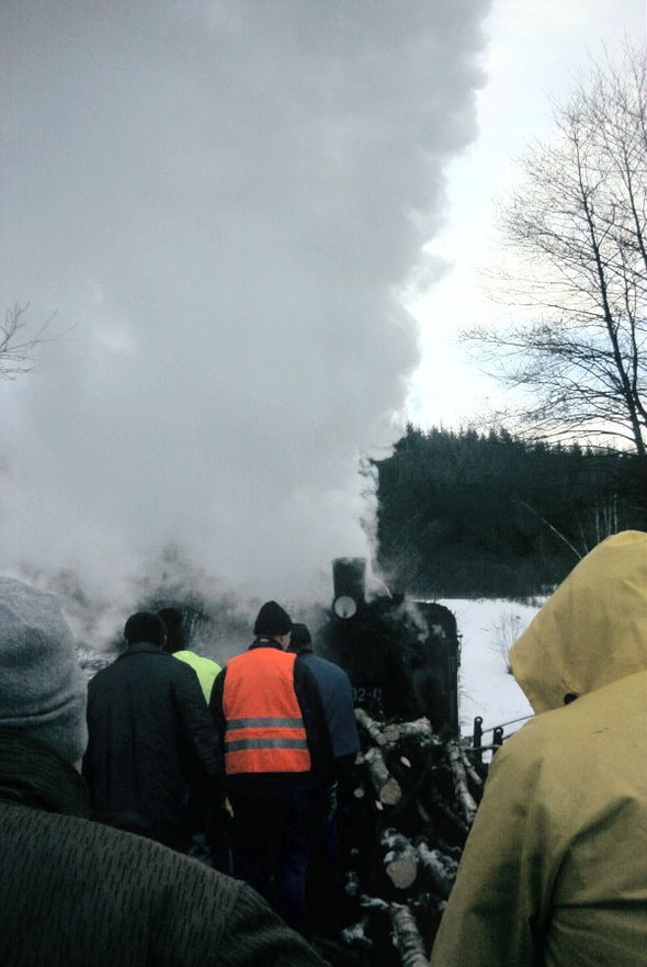 Genau ein Jahr später, am 02. Februar 2012 war ich erneut auf dem Brocken, diesesmal jedoch mit einem Wintersonderzug von Nordhausen aus. Besonderheit bei dieser Fahrt war ohne Zweifel die Tender voran zum Brocken fahrende Lokomotive des Sonderzuges. Bei einer Zugkreuzung bzw. Überholung in Schierke gab es einen heftigen Schneeschauer.