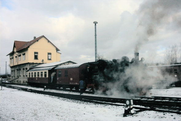Am 11. Dezember 2012 hatte der nächste Winter sich bereits heftig angekündigt, hatte es doch bis hinunter in die unteren Lagen des Harzes enormen Neuschee gegeben. So konnte 99 5906-5 mit ihrem Sonderzug in Eisfelder Talmühle bei ca. 25cm Neuschnee abgelichtet werden.