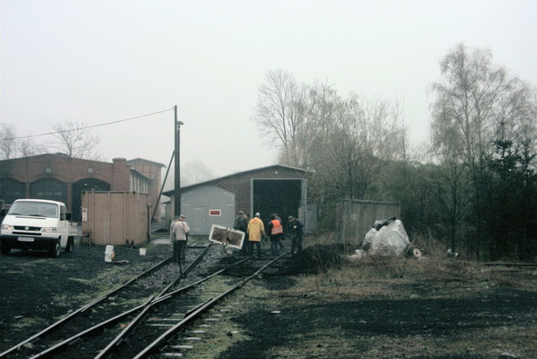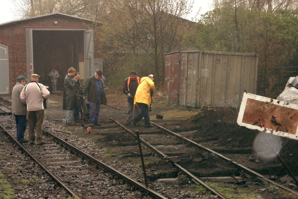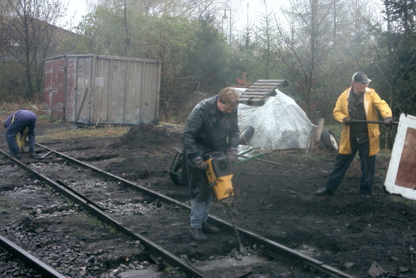 Ein weiterer Arbeitseinsatz während meiner Zeit als Mitglied des Freundeskreises Selketalbahn FKSB fand am 12. April 2002 in Gernrode statt. Es war geplant, das Gleis zum rechten Stand des Triebwagenschuppens teilweise zu sanieren. Damals war dort der GHE-T 1 untergestellt. Der Zustand der Bettung wurde vom damaligen Vorsitzenden des FKSB mit „Harzer Humusbettung“ beschrieben. Vermutlich war an diesem Gleis jahrzehntelang nichts gemacht worden. Nicht nur dass die Schwellen kaum zu sehen waren. Nein die Schwellen unterschieden sich vom umgebenden Material nur unwesentlich. Man konnte sie problemlos zwischen Daumen und Zeigefinger zerbröseln. Die abgängigen Holzschwellen wurden durch Stahlschwellen ersetzt. Die Arbeiten wurden vom Bahnmeister beaufsichtigt. Nachdem die Holzschwelle quasi weggegraben wurde, war die erste Stahlschwelle war bald eingebaut. Nun fehlte es am Schotter. Dieser lagerte auf dem Bahnhofsgelände in Harzgerode. Drei Mann fuhren mit dem Kleinlaster der Bahnmeisterei dorthin, um das nötige Bettungsmaterial heran zu holen. Auch der Autor dieses Beitrages war dabei (rechts im Bild). Derweil wurden in Gernrode weitere „Holzhumusschwellen“ durch Stahlschwellen ersetzt. Sie wurden mit dem Schotter aus Harzgerode unterfüttert. So wie auf diesem Bild zu sehen, musste der Schotter dann verdichtet werden. Auch der Autor dieses Beitrages hatte das „Vergnügen“, den Stopfhammer führen zu dürfen. Er war anschließen ziemlich kaputt – der Autor nicht der Hammer. Gleisbau ist eine harte Arbeit. Das wusste ich theoretisch. Mein Vater hatte nach 1945 in einer Braunkohlengrube im Deubener Revier (zwischen Weißenfels und Zeitz im südlichen Sachsen-Anhalt) im Gleisbau gearbeitet. Er war in den 1930er Jahren Lehrer und durfte diesen Beruf zunächst nicht mehr ausüben. Erst nach der Bewährung in der Produktion unter anderem auch in einer Brikettfabrik kehrte er Ende der 40er Jahre in den Schuldienst zurück. Aus seinen Erinnerungen wusste ich also, wie schwer der Beruf des Gleisbauers ist. Nun hatte ich es selbst erlebt, was aber meiner Entwicklung durchaus zuträglich war. Am Ende des Tages präsentierte sich das das Gleis auf dem ersten Stück hinter der Weiche in einem Zustand, der sich gravierend vom Ausgangszustand unterschied. Damit endet meine Zuarbeit zum 2015er Adventskalender. Ich hoffe, diesen mit meinen Erinnerungen ein wenig belebt zu haben. Im Laufe der Jahre sind ja doch einige davon in meinem Gedächtnis haften geblieben.