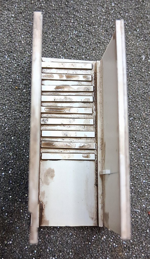 Die schmutzige Flüssigkeit ist Nitroverdünnung, in der ich immer meine Pinsel auswasche und die ich hier zum Verkleben des Polystyrols genommen habe (zusätzlich zur Sekundenkleberverklebung).