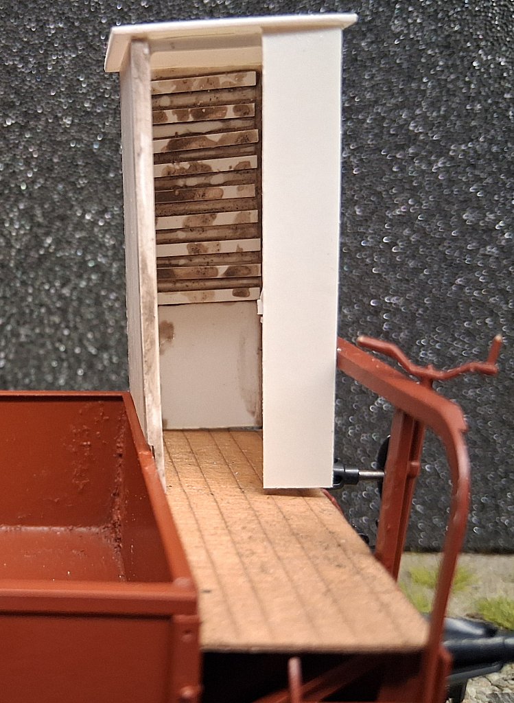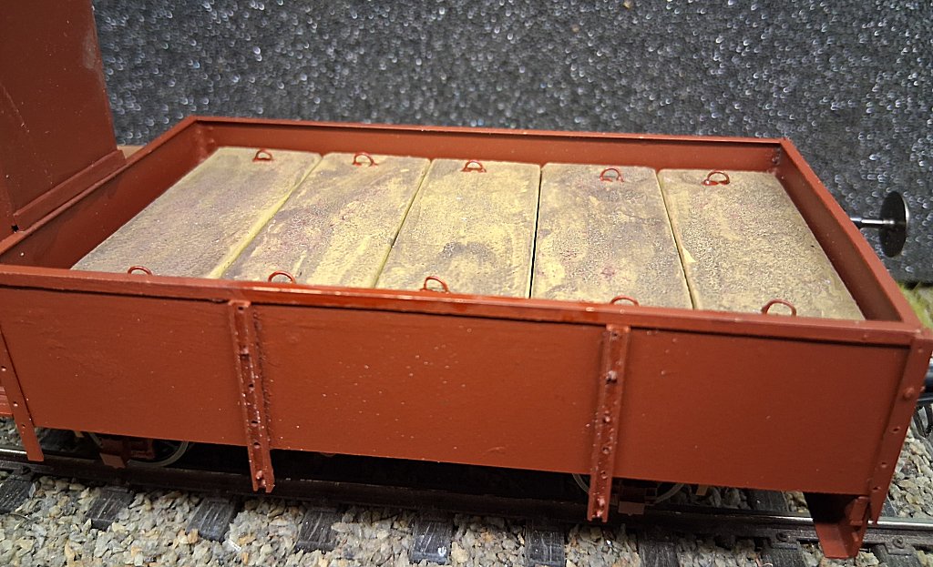 Aufgrund einer Diskussion, ob nun Betonquader oder andere Ballaststeine mit Bretterabdeckung dem Vorbild mehr entsprechen (es gibt aktuell nur zwei Fotos mit Blick in den Wagenkasten, und beides sieht irgendwie nach Bohlenbelag aus) wurde bei diesem Wagen aus 0,5 mm Sperrholz ein entsprechender Bohlenbelag zugeschnitten, mit Weather All gebeizt/gealtert und nach Trocknen aufgeklebt.