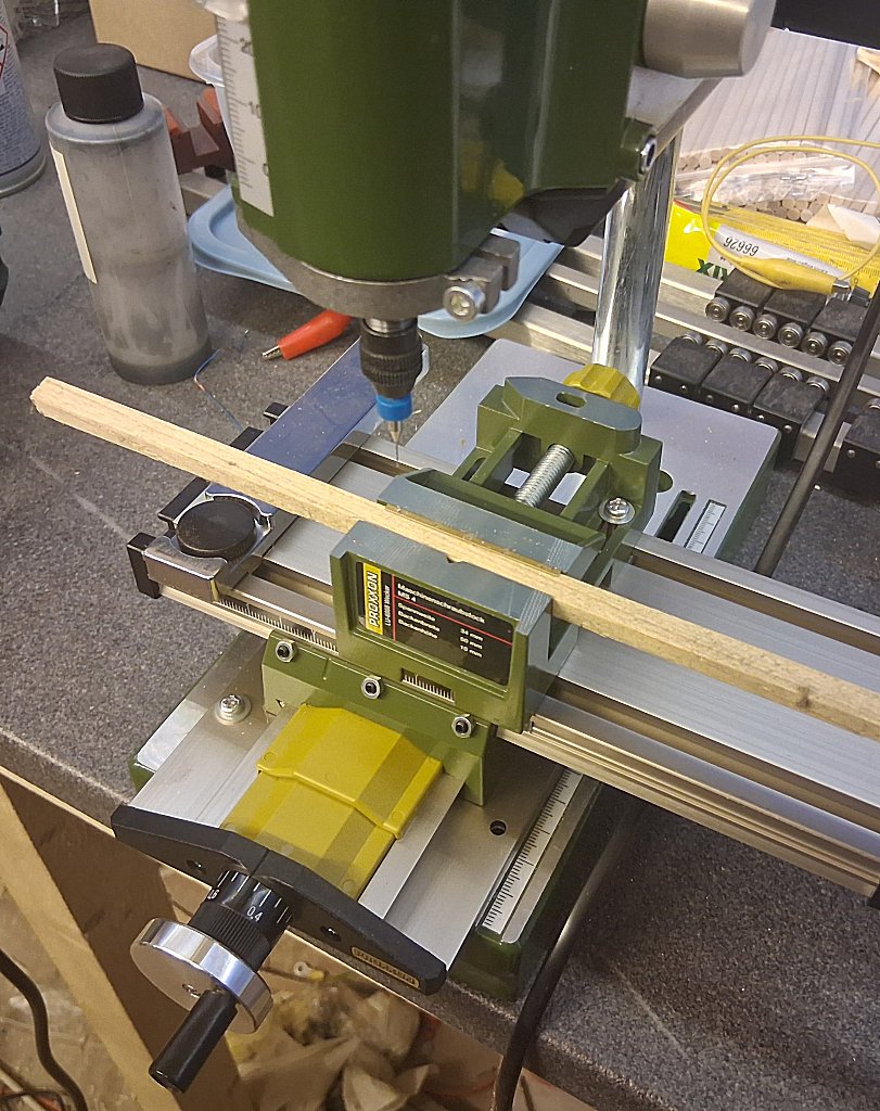 Nachdem ich für den Wagenkasten reichlich 0,6 mm Löcher von Hand in Messing gebohrt hatte, kam mir die Aussage eines Modellbahnstammtischkollegens, der in H0pur tätig ist, das man mit der Proxxon TBM 220 auch 0,3 mm Löcher bohren könne, sehr zu gute. Die hatte ich mir vor einiger Zeit gekauft, aber nie genutzt. Für den Bau des zweiten Bremserhauses habe ich mir dann noch den passenden Kreuztisch und Schraubstock besorgt und konnte dann problemlos die Löcher bohren. Wichtig ist nur, dass der Bohrer sich nicht verhakt, was durch eine Holzunterlage relativ einfach zu lösen ist. Auf dem Bild habe ich ein 1,5 mm Winkelprofil mit einem Raketenstab eingespannt und die Löcher gebohrt.