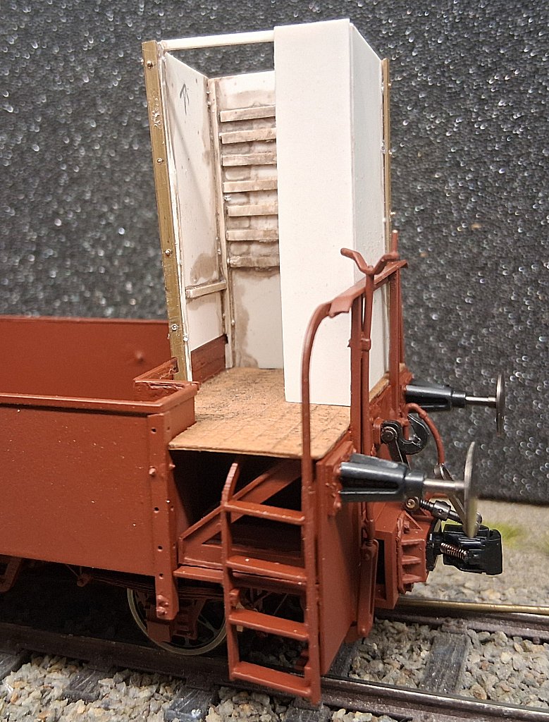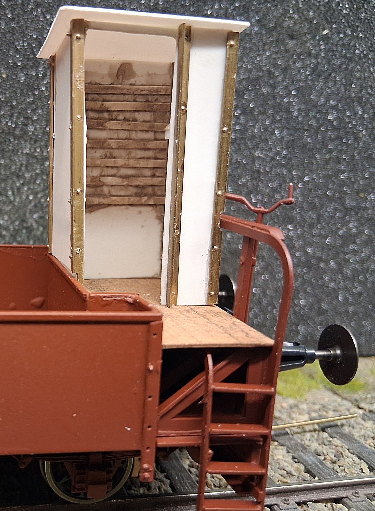 Ich habe beide Bremserhäuser aus Polystyrol 0,5 mm zurechtgeschnitten und verklebt. Auf der Rückwand wurden dünne Evergreen Stripes aufgeklebt, da auf den Vorbildphotos eine Art Lattung hinter der Sitzfläche zu erkennen war. Ob die rundum installiert war ist nicht bekannt und wurde dann auch nur im sichtbaren Bereich installiert.